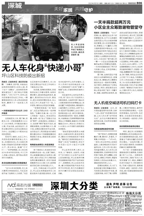 南都讯 记者陈杏花 通讯员邱嘉熙 “消毒液、防护服、米面油这些物资统统都可以往车上装,有了这个‘后勤兵’,运送物资效率更快更及时了,我们再也不用跑断腿了。”3月17日下午,在坪山区马峦街道马峦社区