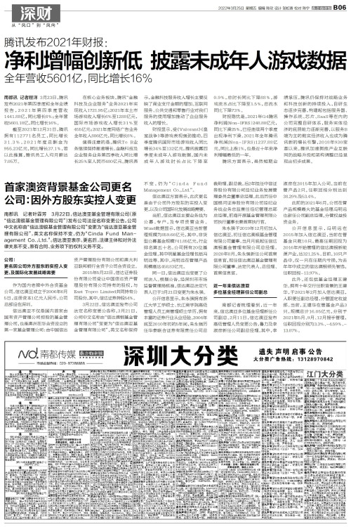 南都讯 记者程洋 3月23日,腾讯发布2021年第四季度和全年业绩报告,2021年第四季度营收1441.88亿,同比增长8%;全年营收5601.18亿,同比增长16%。 截至2021年12月31