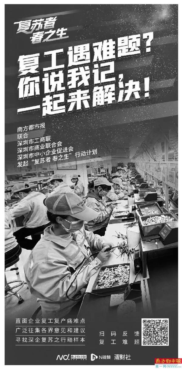 而疫情之下,企业复工复产仍面临诸多痛难点。从即日起,南方都市报联合深圳市工商联、深圳市商业联合会(简称“深商会”)、深圳市中小企业发展促进会发起“复苏者 春之生”行动计划,动员与链接社会各界资源,集众智、聚群力,建言献策,拟联动产学研资,以及政府相关职能部门,共同行动助企纾困,支持企业克服困难,平稳健康发展。