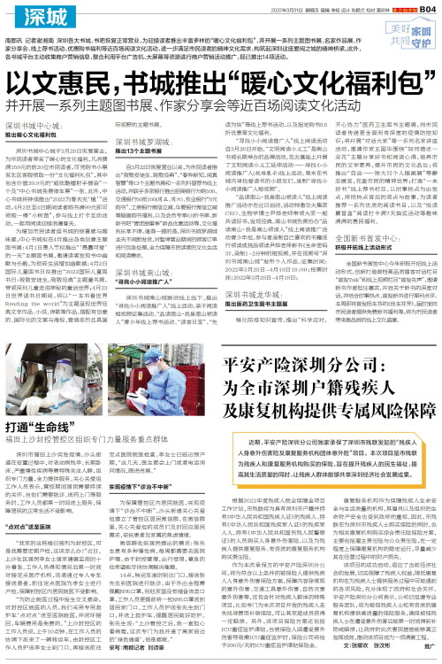南都讯 记者谢湘南 深圳各大书城、书吧恢复正常营业,为迎接读者推出丰富多样的“暖心文化福利包”,并开展一系列主题图书展、名家作品展、作家分享会、线上荐书活动、优惠购书福利等近百场阅读文化活动,进一