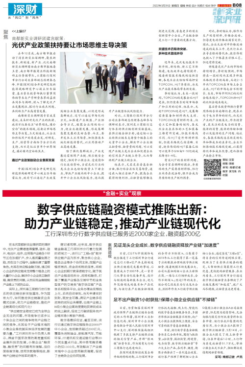 助力产业链稳定,推动产业链现代化在本次南都新实业调研团的调研中,光伏产业赛道值得憧憬,硅料、硅片、电池片、组件、应用等产业链各个环节正在加速扩产,步入高质量发展之路。而在这个过程中,金融扮演了重要角色,尤其在供应链金融方面,通过
