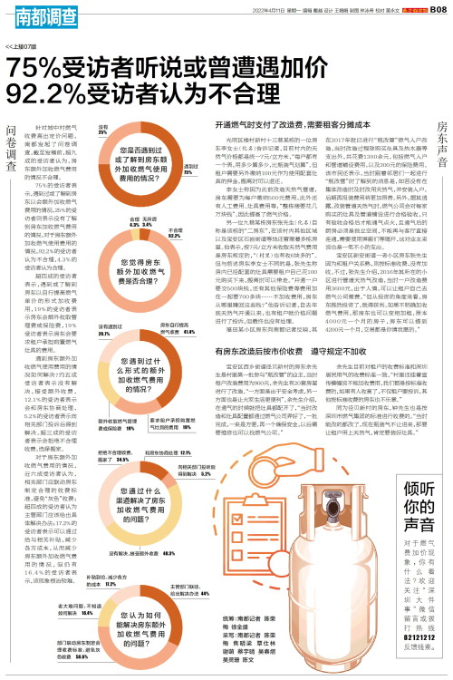 <<上接07版 问卷调查 针对城中村燃气收费高出定价问题,南都发起了问卷调查,截至发稿前,超九成的受访者认为,房东额外加收燃气费用的情况不合理。 75%的受访者表示,遇到过或了解