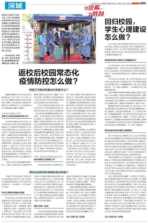 4月8日起,深圳学生陆续迎来返校。经过长达40多天的线上网课,正式返校后,学生心理建设成为了学校重点工作的一环。面对不同学龄段学生、面对不同类型心理压力的学生,深圳各所学校如何织密学生心理建设这道