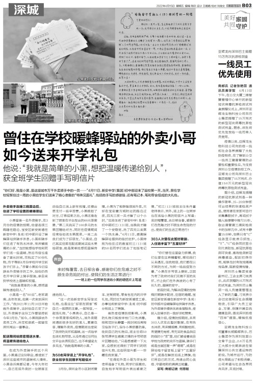 “你们好,我是小黑,是这座城市万千外卖骑手中的一员……”4月11日,新安中学(集团)初中部迎来了返校第一天。当天,曾在学校短暂住过一周的小黑给学生们送来了精心准备的“特殊见面礼”,包括他手写的感谢