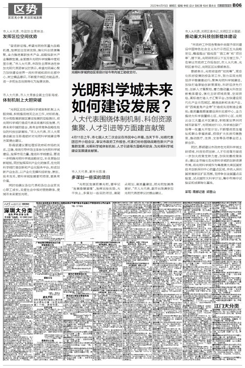 光明科学城启动区项目计划今年内竣工验收交付。 4月11日上午,市七届人大二次会议在市民中心开幕。当天下午,光明代表团召开小组会议,审议市政府工作报