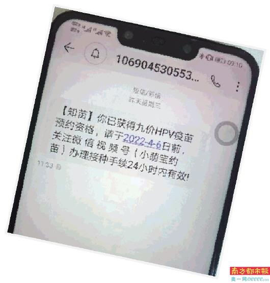 近日,有深圳网友发帖称,其收到短信称获得九价HPV疫苗预约资格,短信显示“关注微信视频号(小萌宝约苗)办理接种手续”。