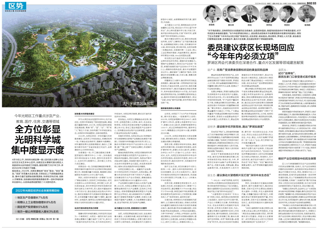 4月19日上午,深圳市光明区第一届人民代表大会第七次会议在区文化艺术中心召开。光明区区长蔡颖代表光明区人民政府向大会作政府工作报告。报告回顾了2021年工作,并对2022年工作进行了部署。 报告