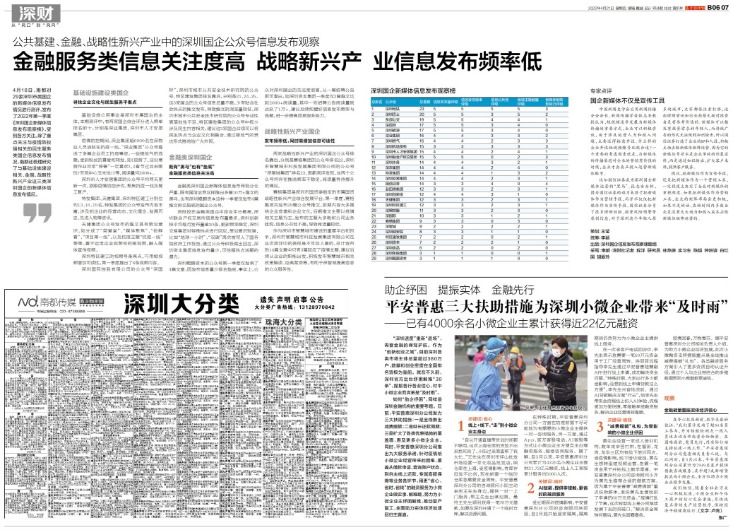 4月18日,南都对29家深圳市属国企的新媒体信息发布情况进行测评,发布了2022年第一季度《深圳国企新媒体信息发布观察榜》,受到各方关注。除了重点关注与疫情防控强相关的民生服务类国企信息发布情况,