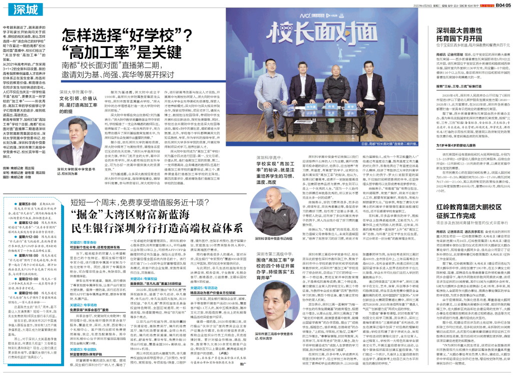 日前,南都“校长面对面”直播第二期开播。 深圳科学高中党委书记尚强 深圳大学附属中学党委书记、校长刘为基