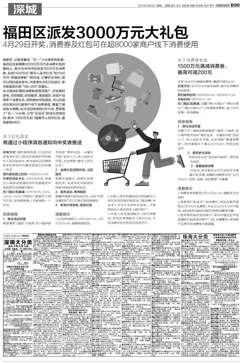 南都讯 记者张馨怡 “五一”小长假即将来袭,福田区在前期推出5000万元汽车消费补贴的基础上,再次为深圳市民派发3000万元消费券,包括1500万元“数字人民币红包”和1500万元“普通消费券”!