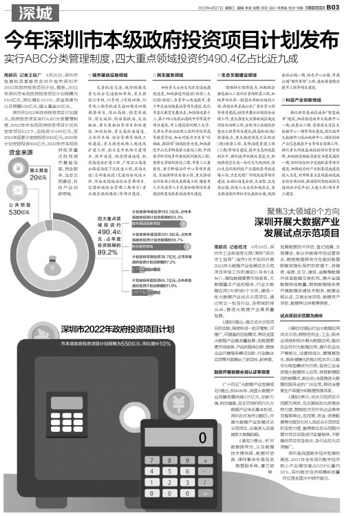 南都讯 记者王睦广 4月25日,深圳市发展和改革委员会对外发布深圳市2022年政府投资项目计划。据悉,2022年深圳市本级政府投资项目计划规模为550亿元,同比增长10.0%,资金来源为公共预算5