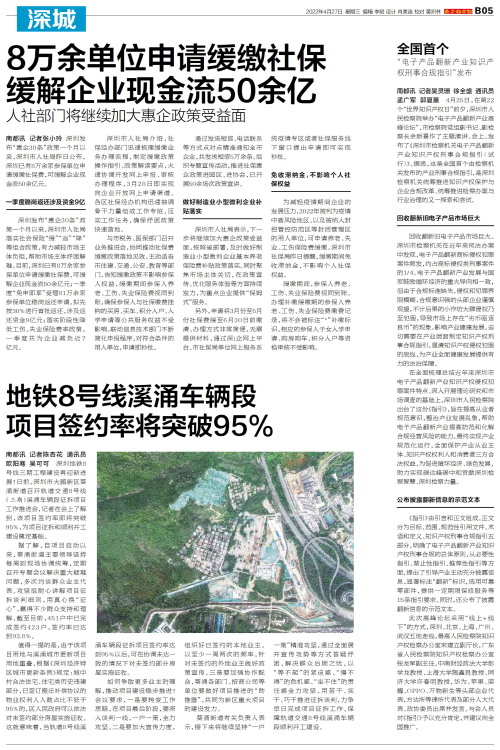 南都讯 记者张小玲 深圳发布“惠企30条”政策一个月以来,深圳市人社局昨日公布,深圳已有8万余家参保单位申请缓缴社保费,可缓解企业现金流50余亿元。 一季度稳岗返还涉及资金9亿 深圳发布“惠企