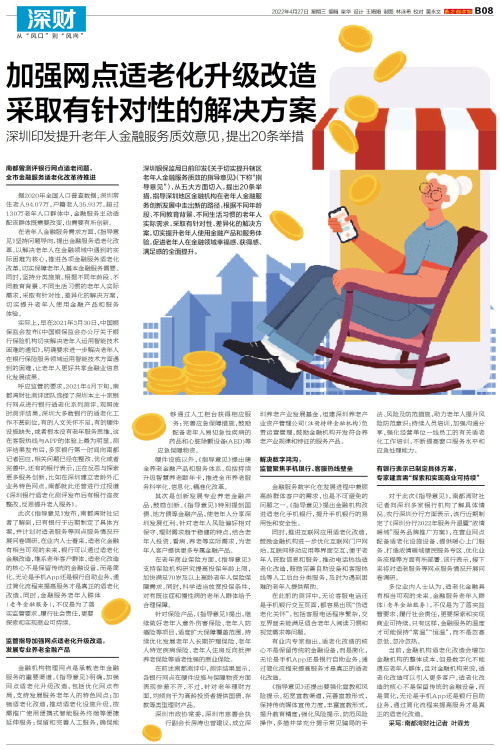 深圳银保监局日前印发《关于切实提升辖区老年人金融服务质效的指导意见》(下称“指导意见”),从五大方面切入,提出20条举措,指导深圳地区金融机构在老年人金融服务创新发展中走出新的路径,根据不同年龄段