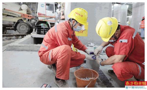 南都记者在地铁12号线赤湾停车场施工现场看到,赤湾停车场已基本成型,全体参建者正努力投入施工生产,现场操作塔机、汽车吊、挖掘机、压路机等100多台大中小型机械设备连续运转,场内钢性接触网安装工作有序开展。