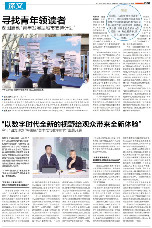 南都讯 记者谢湘南 为庆祝中国共青团建团100周年,在五四青年节来临之际,深圳图书馆在深圳市文化广电旅游体育局和共青团深圳市委员会的指导下,面向社会发起“寻找青年领读者”活动,启动“青年发展型城市