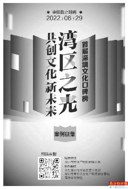 在深圳市文化广电旅游体育局的指导下,南方都市报社携手中共深圳市宝安区委宣传部、深圳市宝安区文化广电旅游体育局推出首届“深圳文化口碑榜”评选活动,活动以“湾区之光 共创文化新未来”为主题,立足深圳,深挖本土,创新城市叙事,打造(湾区)深圳文化IP,形成文化动力的核心引擎,塑造深圳作为国际先锋文化城区的形象。