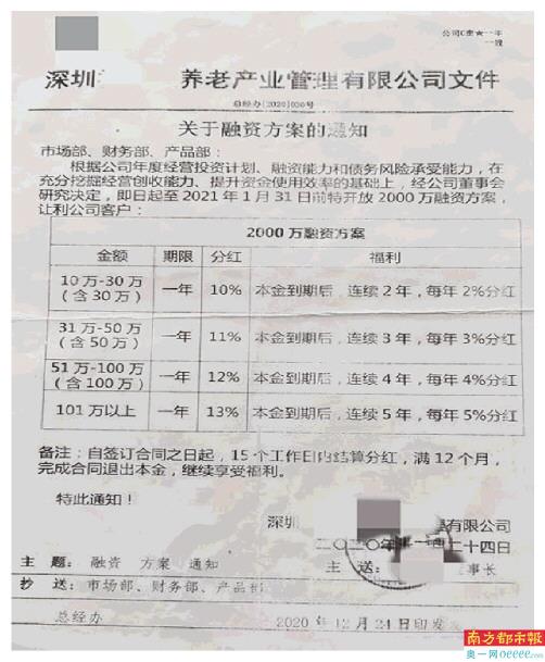 据李大爷称,当时退回押金后,该公司的工作人员来到其所在养老院,向在此养老的老人们宣称有一个“好消息”,公司特开放2000万元融资方案,让利公司客户,即向客户借款。据李大爷提供的《关于融资方案的通知》显示,融资金额在10万至30万元(含30万),在一年融资期限内将获得10%的分红,且“本金到期后,连续2年,每年2%分红”。