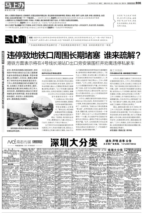被点名单位 龙华区福城街道、港铁轨道交通(深圳)有限公司 近日,有市民向南都记者反映称,深圳地铁4号线长湖站D出口及江围路被私家车违停造成交通堵塞,导致车辆难以正常通行。6月8日,南都记者联系