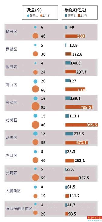在深圳市2022年第三批新开工项目中,南山区共有20个,项目数量在各区中居首,总投资金额达到约127亿元,2022年度计划投资约44亿元。