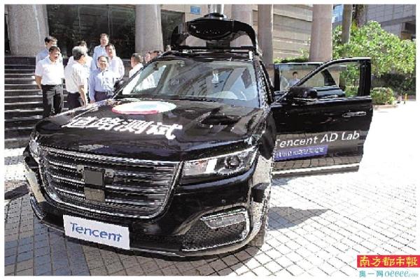 2018年5月14日上午,在深圳市交委举办的智能网联汽车道路测试牌照授牌仪式上,腾讯展示无人驾驶汽车。南都记者 赵炎雄 摄