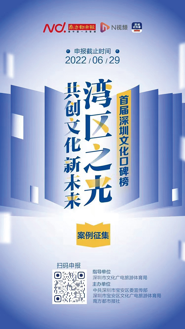 在深圳市文化广电旅游体育局的指导下,南方都市报社携手中共深圳市宝安区委宣传部、深圳市宝安区文化广电旅游体育局推出首届“深圳文化口碑榜”评选活动,活动以“湾区之光 共创文化新未来”为主题,立足深圳,深挖本土,创新城市叙事,打造(湾区)深圳文化IP,形成文化动力的核心引擎,形塑深圳作为国际先锋文化城区的形象。