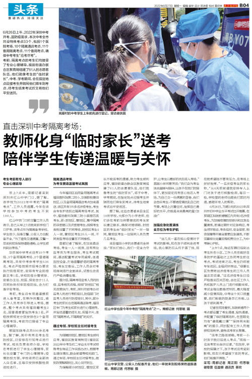 6月26日上午,2022年深圳中考开考。因防疫需求,本次中考全市共设特殊考点33个,包括1个医院考场、10个隔离酒店考点、11个备用隔离考点、11个备用考点,确保中考考生“应考尽考”。考前,隔离考