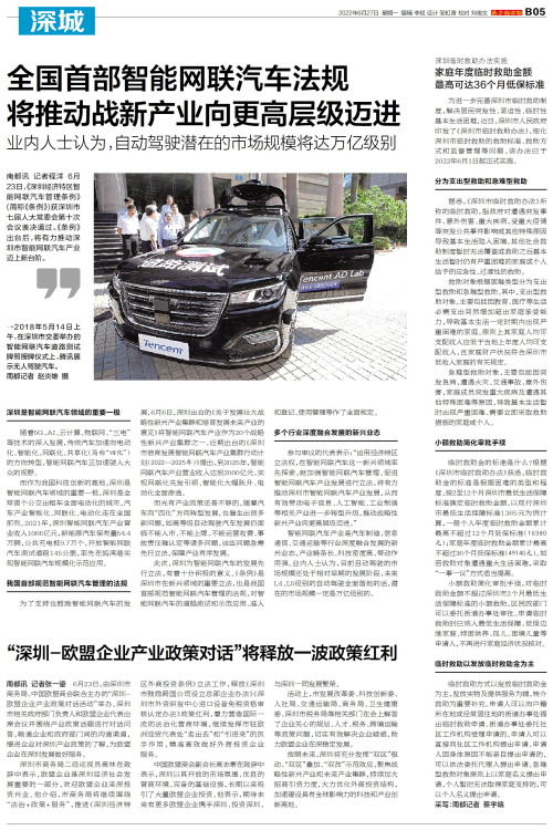 南都讯 记者程洋 6月23日,《深圳经济特区智能网联汽车管理条例》(简称《条例》)获深圳市七届人大常委会第十次会议表决通过。《条例》出台后,将有力推动深圳市智能网联汽车产业迈上新台阶。 深圳是智