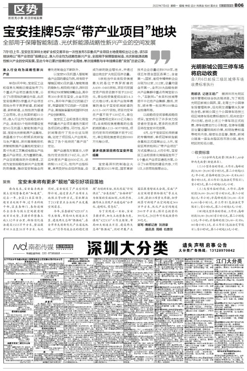 7月1日上午,宝安区在深圳土地矿业权交易平台一次性发布5宗重点产业项目土地使用权出让公告,该5宗地块将以“带产业项目”挂牌出让,准入行业均为战略性新兴产业,全部用于保障智能制造、光伏新能源战略性新