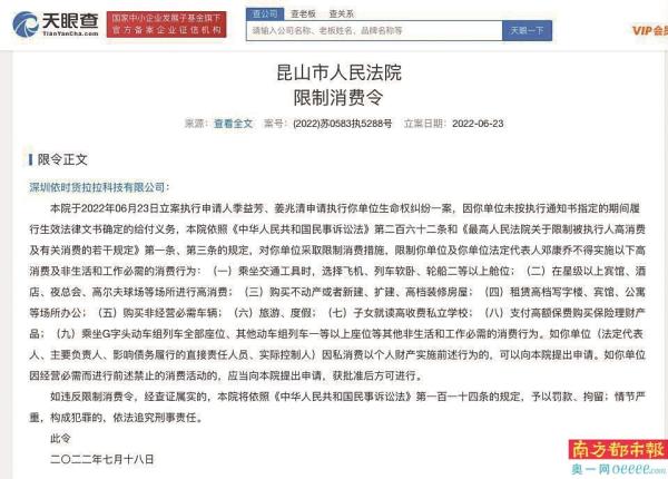 昆山市人民法院限制消费令显示,昆山市人民法院于2022年6月23日立案执行申请人季益芳、姜兆清申请执行深圳依时货拉拉科技有限公司生命权纠纷一案,因深圳依时货拉拉科技有限公司未按执行通知书指定的期间履行生效法律文书确定的给付义务,昆山市人民法院依照相关法律规定,对深圳依时货拉拉科技有限公司采取限制消费措施,限制深圳依时货拉拉科技有限公司及其法定代表人邓康乔不得实施一定高消费及非生活和工作必需的消费行为。