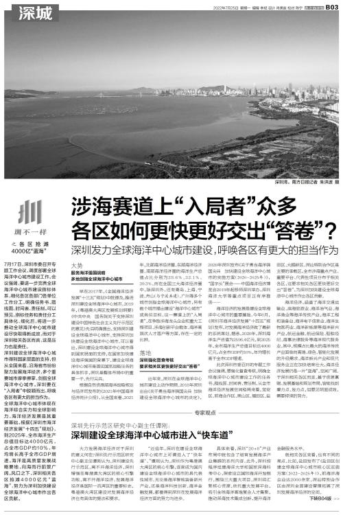 各区抢滩4000亿“蓝海” 7月17日,深圳市委召开专题工作会议,调度部署全球海洋中心城市建设工作。会议强调,要进一步完善全球海洋中心城市建设指标体系,细化各区各部门各单位工作分工,明确任务书、