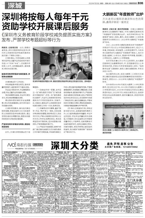 深圳将按每人每年千元资助学校开展课后服务