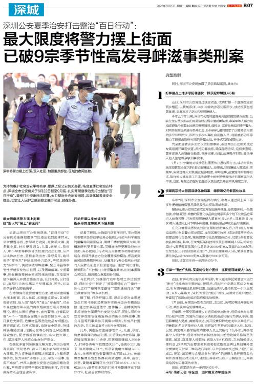 为持续维护社会治安平稳有序,根据上级公安机关部署,结合夏季社会治安特点,深圳全市公安机关于6月22日起至9月底,扎实开展夏季治安打击整治“百日行动”,重拳打击突出违法犯罪,大力整治社会治安问题,攻