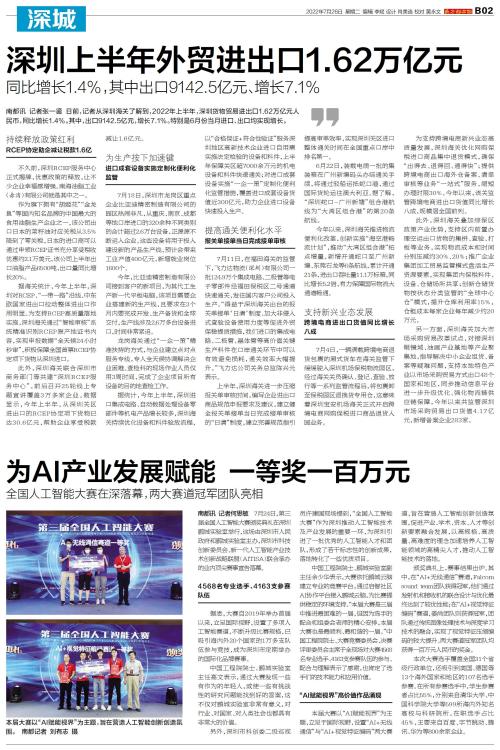 南都讯 记者张一鎏 日前,记者从深圳海关了解到,2022年上半年,深圳货物贸易进出口1.62万亿元人民币,同比增长1.4%。其中,出口9142.5亿元,增长7.1%。特别是6月份当月进口、出口均实