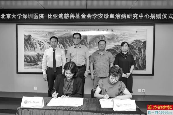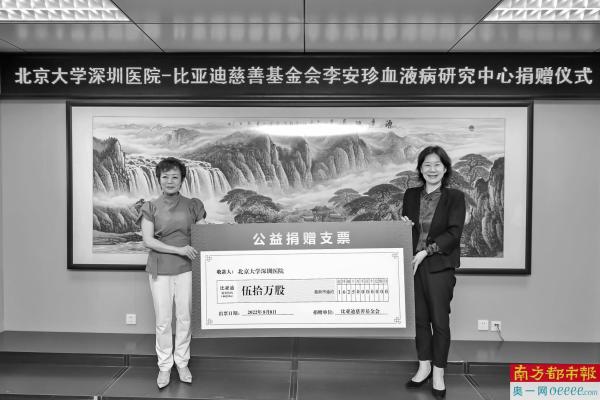 8月8日上午,比亚迪集团执行副总裁李柯女士向北京大学深圳医院捐赠伍拾万股A股股票(市值约1.6亿元),用于设立北京大学深圳医院-“比亚迪慈善基金会‘李安珍’血液病研究中心”,支持北大深圳医院血液内科通过提升病区环境、医疗设备和专科实验室条件等形式,围绕血液病的精准诊断、靶向治疗、造血干细胞移植和新型免疫治疗等前沿技术,开展相关疾病的预防、诊治、基础研究、临床研究和人才引培等工作,最终造福血液肿瘤患者。