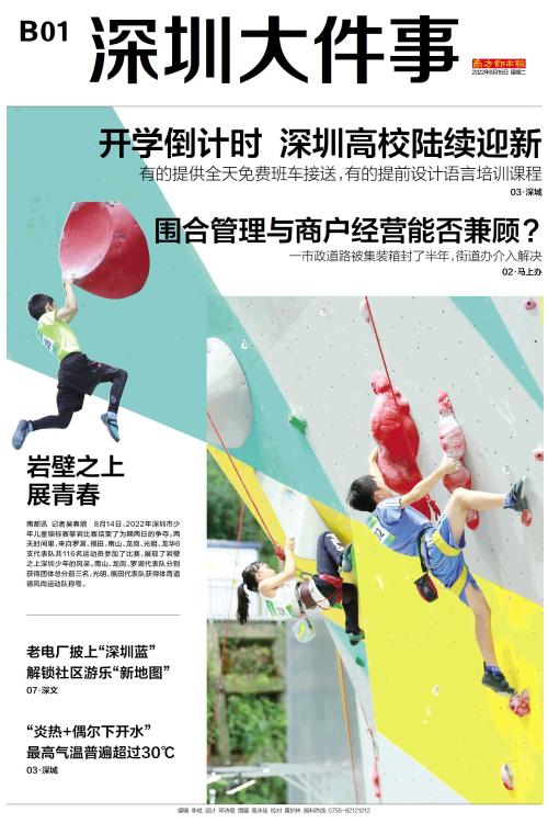 南都讯 记者吴春熠 8月14日,2022年深圳市少年儿童锦标赛攀岩比赛结束了为期两日的争夺。两天时间里,来自罗湖、福田、南山、龙岗、光明、龙华6支代表队共116名运动员参加了比赛,展现了岩壁之上深