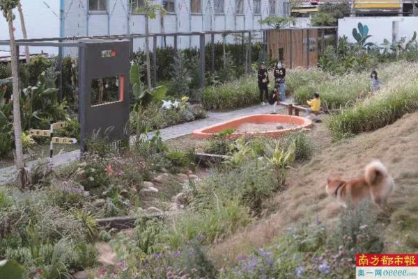场地原本为消极利用的荒草地,现通过下沉式绿地汇集雨水,因地制宜在草坡下设置生态旱溪和雨水花园,并创造性地将老的火车枕木改造成独木桥,极大提升了观赏性和互动性。通过生态本底调查发现场地存在红耳鹎、蝴蝶等“原住民”,最大程度保留原有群落,增加食源浆果植物及灌丛,营造“鸟类生境”;增加蜜源植物与宿主植物,营造“传粉昆虫生境”,提升场地的生物多样性。