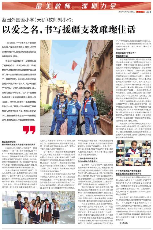 “我只是做了一个教育工作者应该做的事。”深圳福田荔园外国语小学(天骄)教师刘小玲,轻描淡写地述说着自己的教育经历、感悟。 但这些“应该做的事”,却恰恰汇成了精彩的传