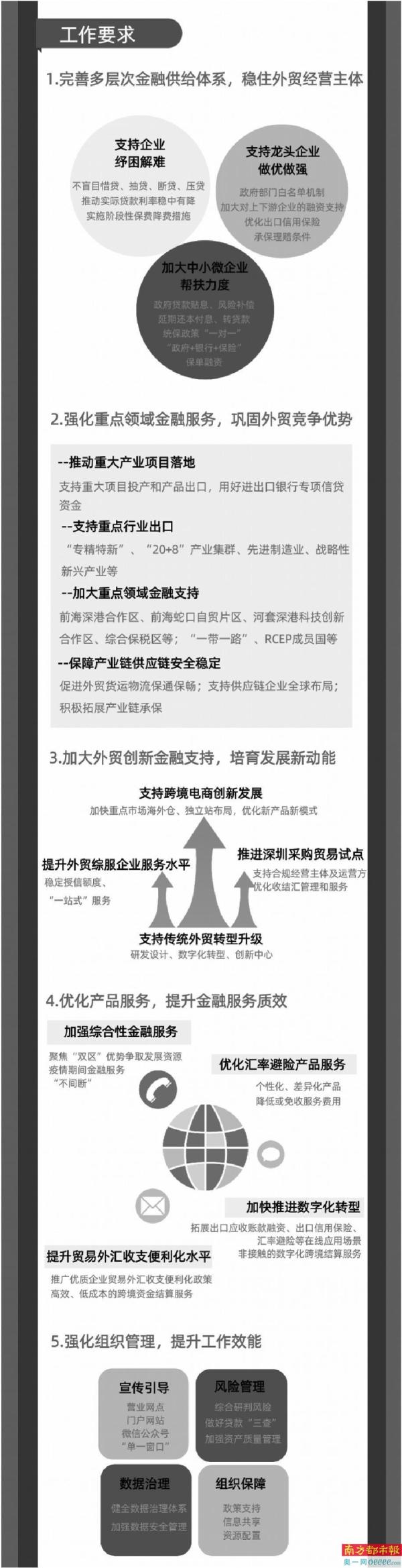 同时深度融合深圳外贸行业发展规划。根据广东省和深圳市的外贸行业发展规划,聚焦深圳外贸行业竞争优势,认真研究金融支持政策一并纳入《实施意见》。