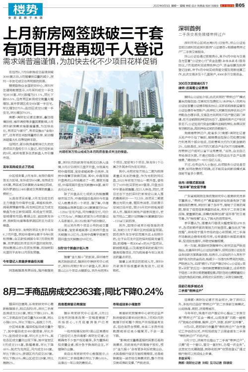 据深圳住建局、乐有家研究中心最新数据显示,刚过去的8月,深圳二手商品房成交2363套,同比下降0.24%。其中二手商品住宅成交量为2000套,同比小降0.19%,环比下降2%,连跌三个月。 分区