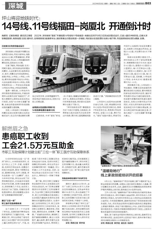 南都讯 记者张艳丽 通讯员王禹程 2022年,深圳地铁“首批”开通线路14号线和11号线福田-岗厦北区间于9月23日完成空载试运行,已进入最后冲刺阶段。记者从深铁集团获悉,两条线路(区段)通车后,