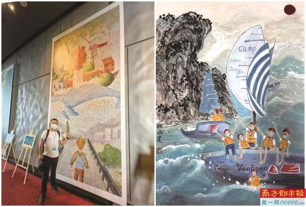 由深圳青少年儿童创作的画作在本次展览中也是大放异彩,不仅有《鲤鱼跳龙门》、《天空之城》、《爱的守候 中国人寿》等9幅作品获选入展,特别值得一提的是,由黄问桐创作的《天空之城》画作,被制作成了一幅3米高的巨幅数字拼图,悬挂于国家大剧院的大厅内;黄楚馨创作的画作《爱的守候 中国人寿》,则成为了全国首幅视频推荐作品,在《画展背后的故事》栏目中播出。