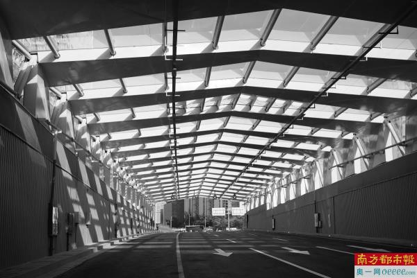 除了解决隧道内部的尾气排放,隧道外部设计也是别出心裁。建设中心有关负责人向记者介绍,桂庙路的三个隧道主出口隔音屏采用不同风格设计。其中,西侧隧道口采用拱形骨架,寓意“腾飞的双翼”,与前海月亮湾跨线桥连成有机整体。东侧隧道出口和进口分别采用具有力量感的钢骨架隔音屏设计,体现城市向前的动力。而隧道内部装饰,则采用防火搪瓷钢板,搭配连续的照明灯带,不仅大大提高了桂庙路整体景观品质,更为市民创造了舒适、明亮、安全的隧道驾乘环境。