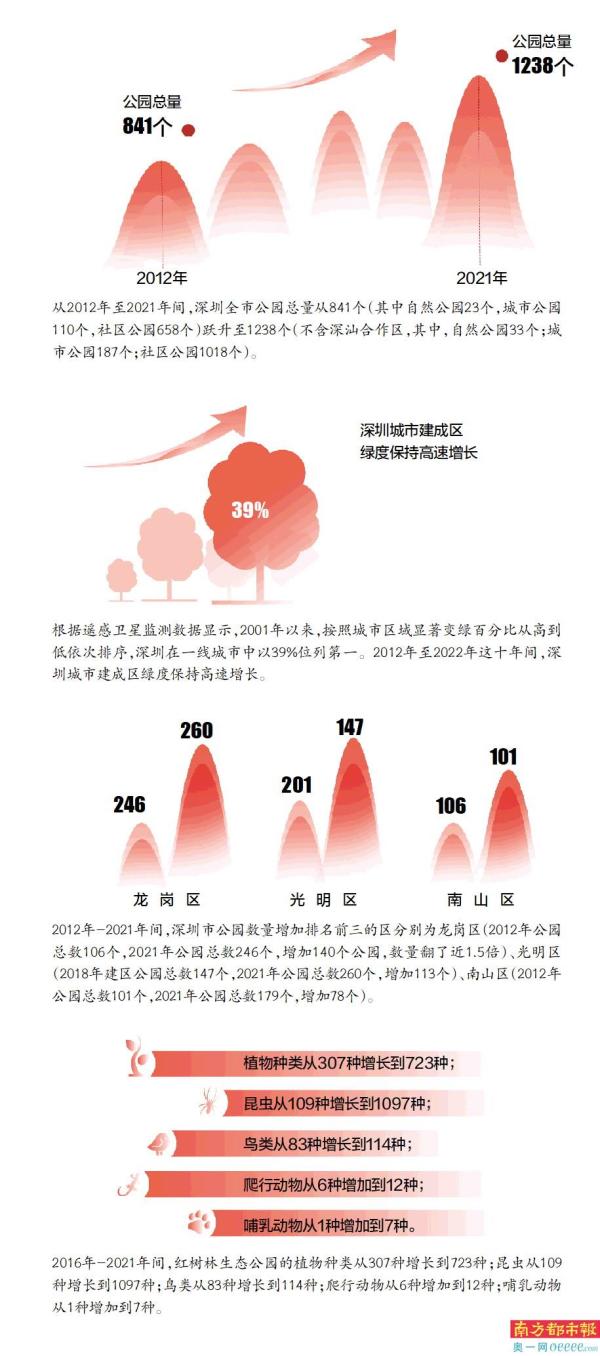 记者从深圳市城管和综合执法局了解到,2012年-2021年间,深圳市公园数量增加排名前三的区分别为龙岗区(2012年公园总数106个,2021年公园总数246个,增加140个公园,数量翻了近1.5倍)、光明区(2018年建区公园总数147个,2021年公园总数260个,增加113个)、南山区(2012年公园总数101个,2021年公园总数179个,增加78个)。