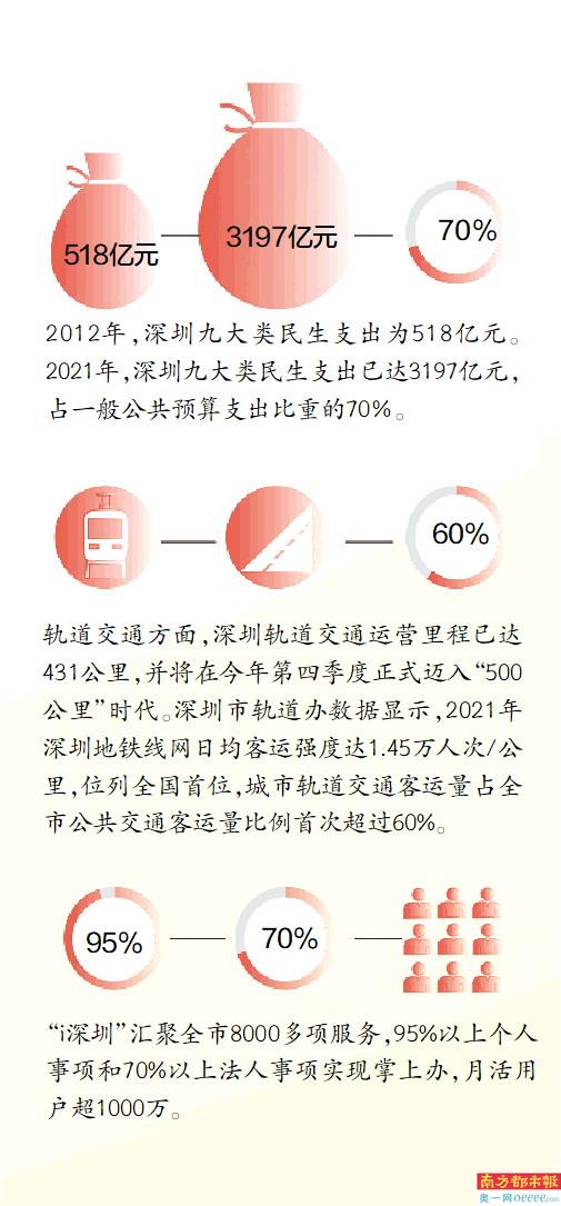 2012年,深圳九大类民生支出为518亿元。2021年,深圳九大类民生支出已达3197亿元,占一般公共预算支出比重的70%。真金白银的投入,带来了看得见、摸得着的变化,赢得了市民有口皆碑的好评。