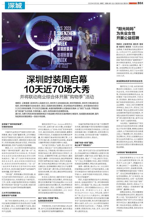 南都讯 记者黄璐 由深圳市人民政府主办,深圳市工业和信息化局、深圳市商务局、深圳市工商业联合会组织,深圳市服装行业协会承办,各区人民政府(新区管委会、深汕特别合作区管委会)、欢乐海岸协办的S/S