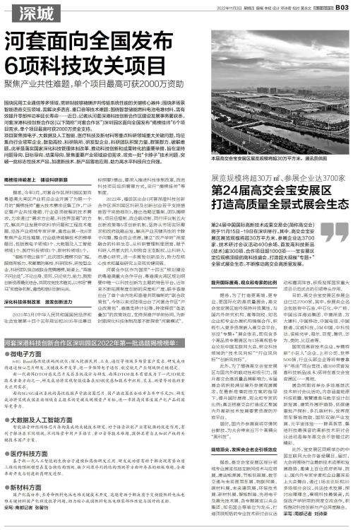 第24届中国国际高新技术成果交易会(简称高交会)将于11月15日-19日在深圳举行。其中,高交会宝安展区展览规模将超30万平方米、参展企业达3700家、技术研讨会议活动400余场、首发高科技新品(