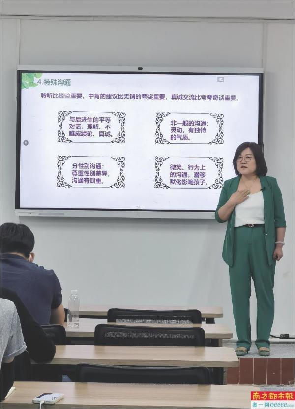福田中学李元琳具有“麻辣班主任”之称,是深圳市第二、第三批名班主任工作室主持人、资深高中班主任,她曾一人同时担任两个班的班主任。她提到,对待“特殊孩子”,需要针对性地施展一些技巧。首先要端正自己的角色和态度。“‘老师’不是警察,不是法官,你不要总是去断案,谁对谁错。一些学生的不良行为,不必过于咄咄逼人地追究,因为这些‘小动作多’的孩子,内心有一个洞,有一个需要被关注,被爱,被肯定的洞。”她表示,老师要永远看到学生的闪光点和积极之处。“因为教育面向未来,我们一定要有一双积极的眼睛。以积极的思维,看待自己,看待教育,看待危机。”