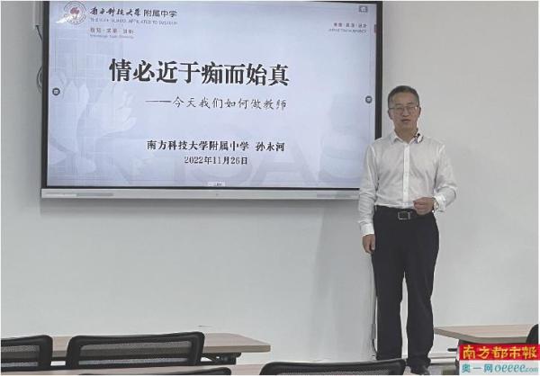 南方科技大学附属中学副校长孙永河分享《今天,我们如何做教师》。他认为要以“爱”为核心引擎驱动教育事业。“真教育是心心相印的活动,唯独从心里发出来的,才能抵达心的深处。”他提出,不论做老师还是班主任,最为重要的一个素质就是要发自内心地爱学生。“有的老师他自认为自己非常爱学生,但是在学生那里,并没得到很好的反馈,并没有得到他所期望的评价。老师爱学生,只有学生感受到了,并且让学生认为老师真是爱我们,老师的爱才真正有价值。”