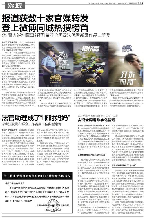 南都讯 记者吴灵珊 近日,2021年度全国政法优秀新闻作品评选结果揭晓,其中,南方都市报联合深圳市公安局推出的《圳警人说圳警事》系列获二等奖。 2021年下半年,南方都市报社深圳新闻中心围绕讲好