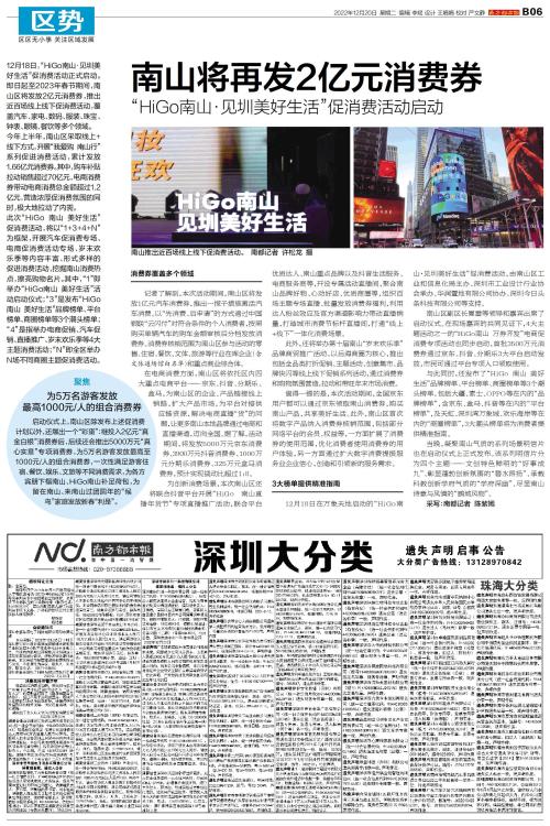 12月18日,“HiGo南山·见圳美好生活”促消费活动正式启动。即日起至2023年春节期间,南山区将发放2亿元消费券,推出近百场线上线下促消费活动,覆盖汽车、家电、数码、服装、珠宝、钟表、眼镜、餐